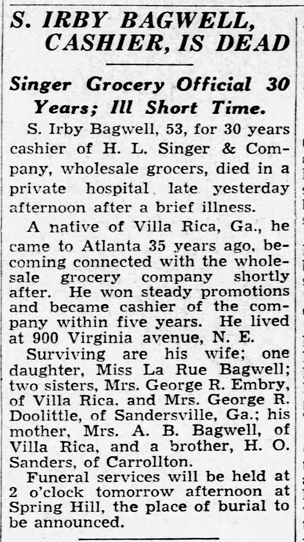 - [S5738] S. Irby Bagwell Grave Stone, Find a Grave, www.findagrave.com, https://www.findagrave.com/memorial/202248063