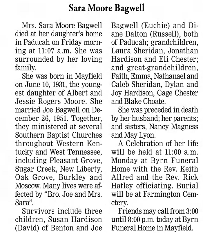 Sarah Nell Moore was born on 10 June 1931 in Mayfield, Graves County, Kentucky.1 As of after 1950,her married name was Bagwell. She married Reverend Joe Bert Bagwell, son of Samuel Burnett Bagwell and Marine Chester, after 1950. Sarah Nell Moore died on 28 January 2011 in Paducah, McCracken County, Kentucky, at age 79 Mrs. Sara Moore Bagwell died at her daughter's home in Paducah on Friday morning at 11:07AM. She was surrounded by her loving family. She was born in Mayfield on June 10, 1931, the youngest daughter of Albert and Jessie Rogers Moore. She married Joe Bagwell on December 26, 1951. Together, they ministered at several Southern Baptist Churches throughout Western Kentucky and West Tennessee, including Pleasant Grove, Sugar Creek, New Liberty, Oak Grove, Burkley and Moscow. Many lives were affected by "Bro. Joe and Mrs. Sara". Survivors include 3 children: Susan Hardison (David) of Benton, Joe Bagwell (Euchie) and Diane Dalton (Russell) of Paducah, grandchildren Laura Sheridan, Jonathan Hardison, Eli Chester; great-grandchildren Faith, Emma, Nathanael and Caleb Sheridan, Dylan and Joy Hardison, Gage Chester and Balke Choate. She was preceded in death by her husband, parents and sisters Nancy Magness and May Lyon. A Celebration of her life will be at 11:00AM Monday at Byrn Funeral Home with Rev. Keith Allred and Rev. Rick Hatley officiating. Burial will be in the Farmington Cemetery. Friends may call from 3:00-8:00PM Sunday at Byrn Funeral Home in Mayfield. She was buried at Farmington Cemetery, Farmington, Graves County, Kentucky.1
