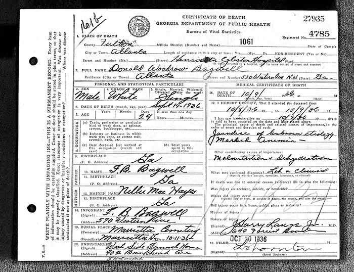 Donald Woodrow Bagwell was born on 8 October 1936 in Henrietta Egleston Hospital for Children, Atlanta, Georgia.1 He died on 9 October 1936 in Henrietta Egleston Hospital for Children, Atlanta, Georgia.1 He was the son of Forrest Buren Bagwell and Nellie Mae Hayes. Donald Woodrow Bagwell was buried on 11 October 1936 at Marietta City Cemetery, Marietta, Cobb County, Georgia.1