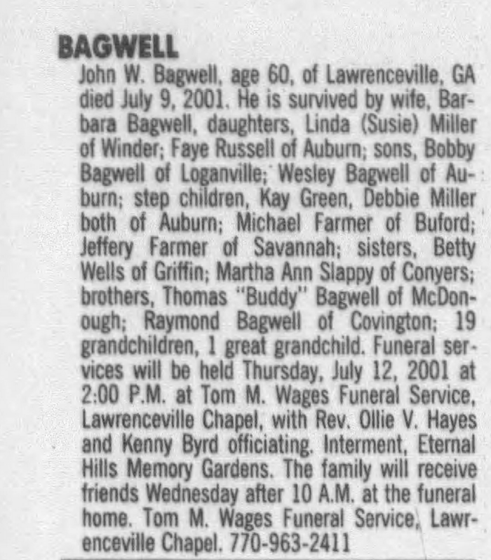 John Wesley Bagwell was born on 12 January 1941 in Snellville, Gwinnett, Georgia.1 He was the son of Forrest Buren Bagwell and Nellie Mae Hayes. John Wesley Bagwell married Barbara Ann Stephens after 1957. John Wesley Bagwell died on 9 July 2001 in Lawrenceville, Georgia, at age 60. He was buried on 11 July 2001 at Eternal Hills Cemetery, Snellville, Gwinnett County, Georgia.