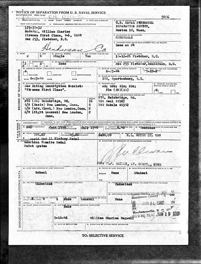 William Charles Bagwell was born on 12 October 1926 in Henderson County, North Carolina. He was the son of William Clay Bagwell and Leona S. Singleton. William Charles Bagwell married Sarah Estella Roberts before 1954. William Charles Bagwell died on 25 April 2011 in Fletcher, Henderson County, North Carolina, at age 84