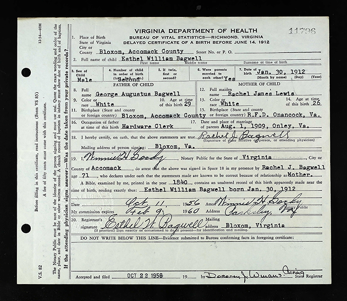 Esthel William Bagwell was born on 30 January 1912 in Bloxom, Accomack County, Virginia.1 He was the son of George Augustus Bagwell and Rachel Lewis. Esthel William Bagwell married Annie Francis Bernard before 1943. Esthel William Bagwell died on 20 August 1997 in Bloxom, Accomack County, Virginia, at age 85.1 He was buried at Parksley Cemetery, Parksley, Accomack County, Virginia.1