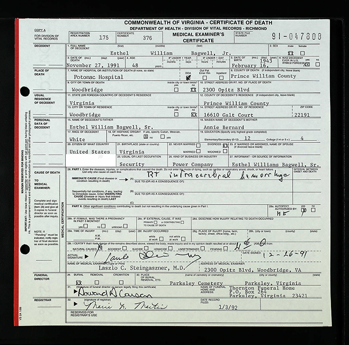 Esthel William Bagwell Jr. was born on 16 February 1943 in Accomack County, Virginia.1 He was the son of Esthel William Bagwell and Annie Francis Bernard. Esthel William Bagwell Jr. married Linda Jean Hockman on 30 July 1967 at Virginia. Esthel William Bagwell Jr. and Linda Jean Hockman were divorced on 17 September 1975 at Stafford, Virginia. Esthel William Bagwell Jr. died on 20 November 1991 in Potomac Hospital, Woodbridge, Prince William County, Virginia, at age 48.1 He was buried at Parksley Cemetery, Parksley, Accomack County, Virginia.1