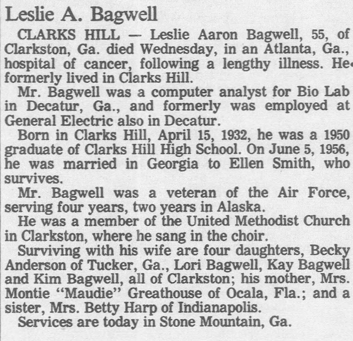 Leslie Aaron Bagwell was born on 15 April 1932 in Clarks Hill, Tippecanoe County, Indiana. He was the son of Lewis A. Bagwell and Montie Lee Bybee. He served in the US Air Force from December 20, 1951 to December 15, 1955. Leslie Aaron Bagwell married Ellen F. (?) on 5 June 1956 at Georgia. Leslie Aaron Bagwell died on 13 April 1988 in Atlanta, Georgia, at age 55. He was buried at Floral Hills Memory Gardens, Tucker, DeKalb County, Georgia.