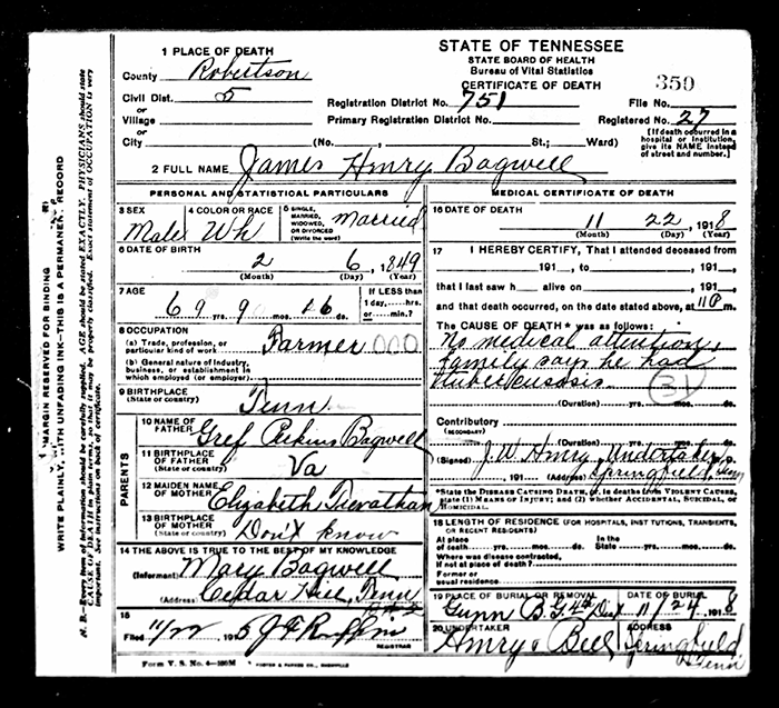 James Henry Bagwell was born on 6 February 1849 in Robertson County, Tennessee.1,2 He was the son of Grif Perkins Bagwell and Elizabeth Rose.1 He served in the D Company, 48th Kentucky Mounted Infantry to the E Company, 26th Kentucky Infantry of the Union Army during the Civil War. James Henry Bagwell married N. C. Luye on 26 December 1867 at Robertson County, Tennessee.2 James Henry Bagwell married Mary Frances Gainous on 2 June 1898 at Robertson County, Tennessee. James Henry Bagwell died on 22 November 1918 in Robertson County, Tennessee, at age 69 of tuberculosis based on the familystatements on the death certificate.