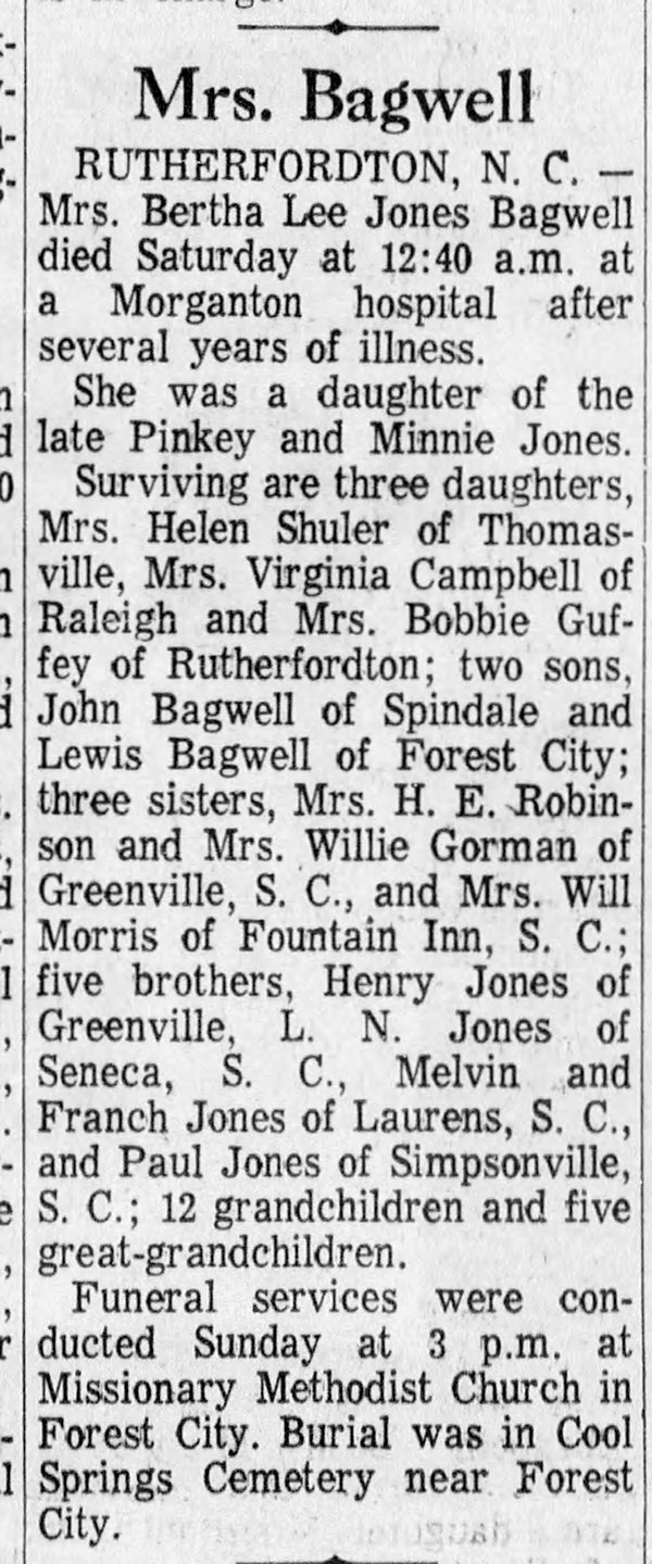 Bertha Lee Jones was born on 15 November 1897 in Henderson County, North Carolina.1 As of before 1918,her married name was Bagwell. She married John Olen Bagwell, son of John Owen Bagwell and Ona Bailey, before 1918. Bertha Lee Jones died on 30 December 1967 in Morganton, Burke County, North Carolina, at age 70.1 She was buried on 31 December 1967 at Cool Springs Cemetery, Forest City, Rutherford County, North Carolina.1