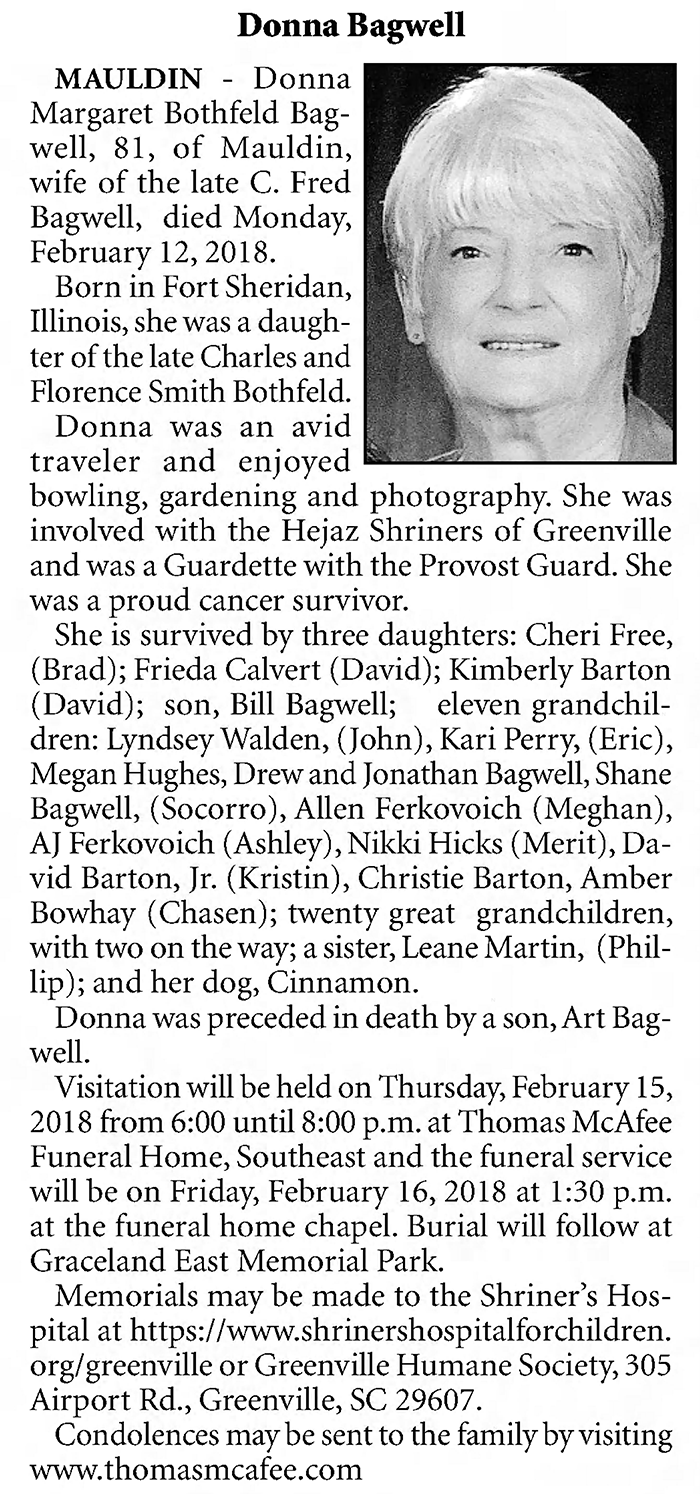 She is survived by three daughters: Cheri Free, (Brad); Frieda Calvert (David); Kimberly Barton (David); son, Bill Bagwell; eleven grandchildren: Lyndsey Walden, (John), Kari Perry, (Eric), Megan Hughes, Drew and Jonathan Bagwell, Shane Bagwell, (Socorro), Allen Ferkovoich (Meghan), AJ Ferkovoich (Ashley), Nikki Hicks (Merit), David Barton, Jr. (KristDonna Margaret Bothfeld Bagwell, 81, of Mauldin, wife of the late C. Fred Bagwell, died February 12, 2018.