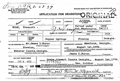 Prescott Bush was born in 1758 in Edgefield County, South Carolina.1 He was the son of Richard Bush and Mary Jane Prescot.1 He fought in the Revolutionary War. He served under Colonel Washington. Believe this to be William Augustine Washington (February 28, 1752 to March 6, 1810), was a cavalry officer of the Continental Army during the American Revolutionary War, who held a final rank of brigadier general in the newly created United States after the war. Primarily known as a commander of light dragoons, he led mounted troops in a number of notable battles in the Carolinas during the campaigns of 1780 and 1781.1 Prescott Bush married Susannah Hinds before 1787. Prescott Bush died on 23 June 1846 in Stewart County, Georgia.1 He was buried at Poplar Springs Cemetery, Preston, Webster County, Georgia.