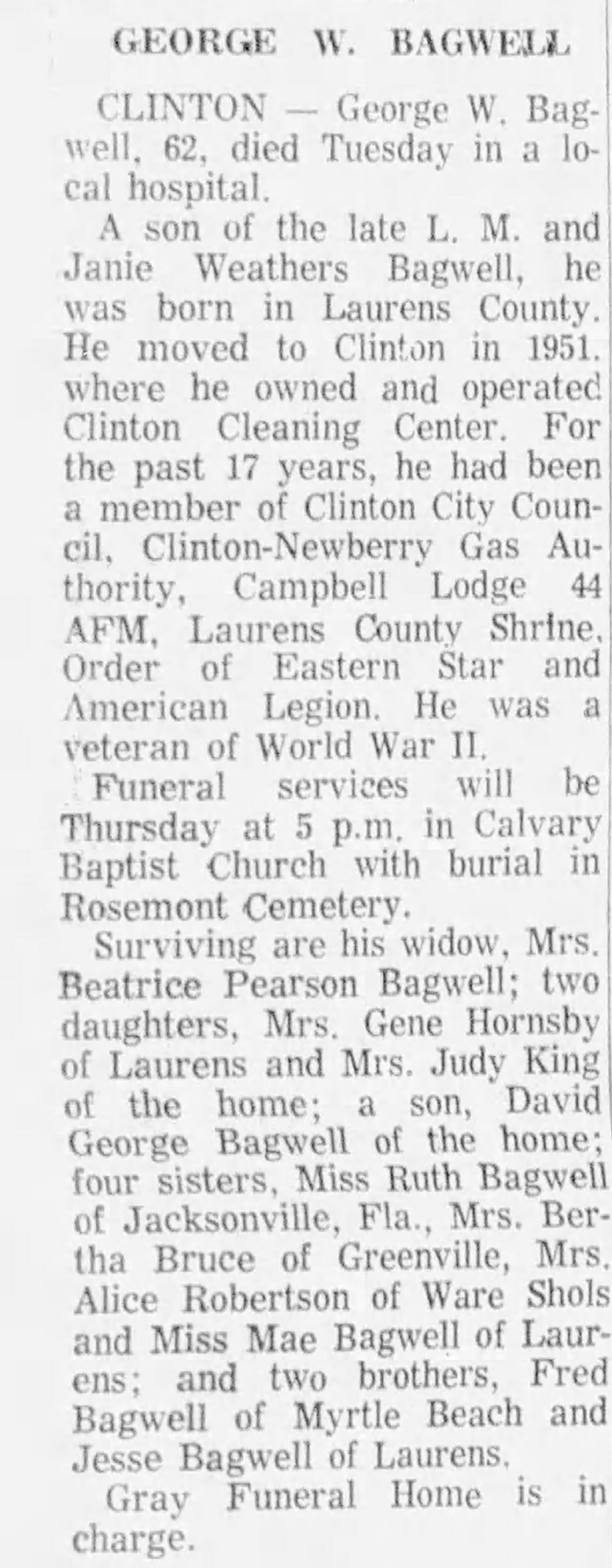 George Washington Bagwell was born on 30 September 1908 in South Carolina. He was the son of Luther Mack Bagwell and Janie Sue Weathers. George Washington Bagwell married Beatrice Mille Pearson on 13 October 1943 at Wattsville, South Carolina. George Washington Bagwell died on 14 September 1971 in Clinton, Laurens County, South Carolina, at age 62. He was buried on 16 September 1971 at Rosemont Cemetery, Clinton, Laurens County, South Carolina.