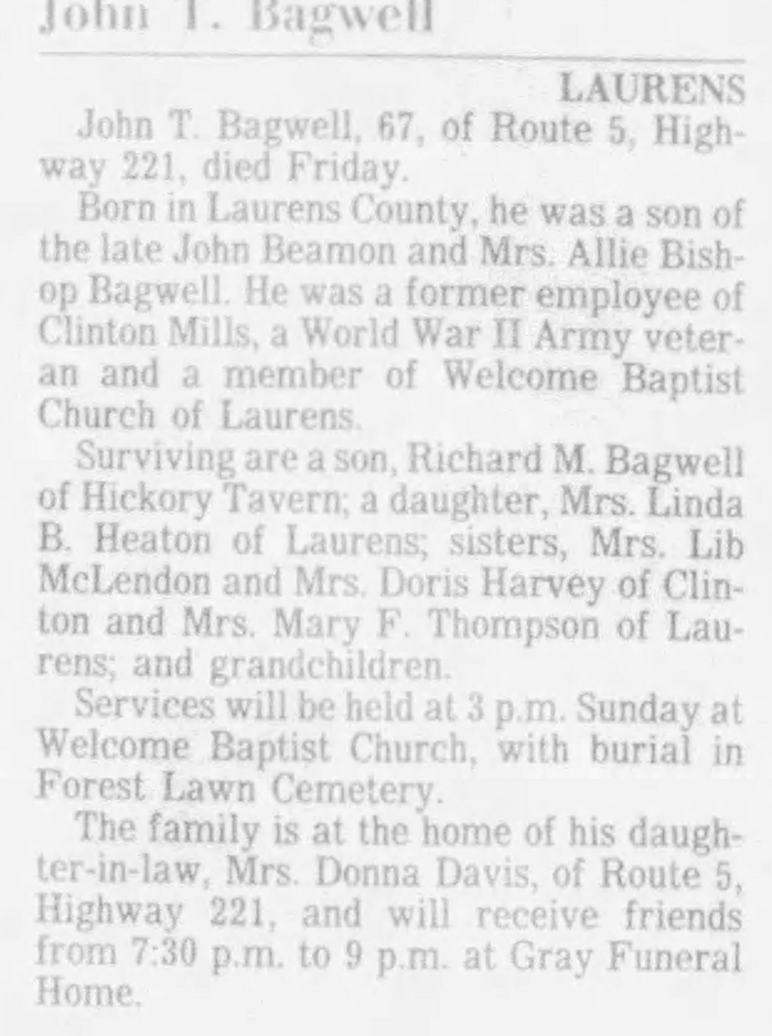 John Henry Bagwell was born on 6 November 1906 in Laurens County, South Carolina. He was the son of Luther Mack Bagwell and Janie Sue Weathers. John Henry Bagwell died on 3 May 1970 in Spartanburg, Spartanburg County, South Carolina, at age 63. He was buried at Greenlawn Memorial Gardens, Spartanburg, Spartanburg County, South Carolina.