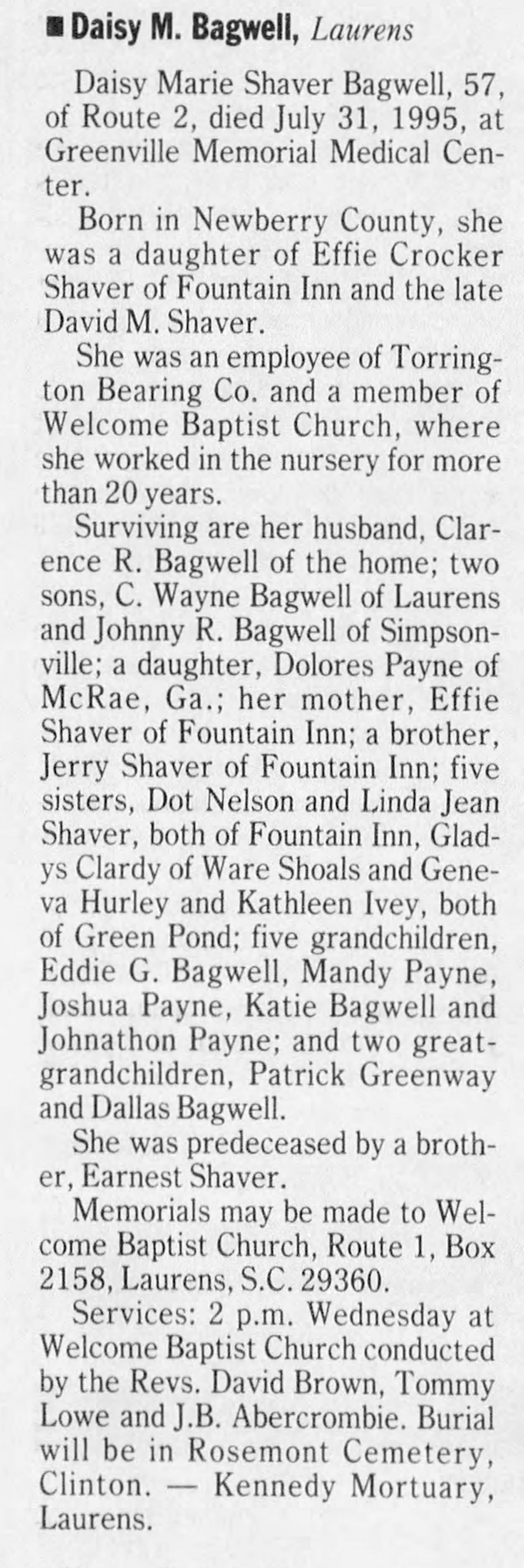 Daisy Marie Shaver was born on 26 February 1938 in Newberry County, South Carolina. As of after 1952,her married name was Bagwell. She married Clarence Ross Bagwell, son of John William Bagwell and Sallie Mae Willard, after 1952. Daisy Marie Shaver died on 31 July 1995 in Greenville Memorial Medical Center, Greenville, Greenville County, South Carolina, at age 57. She was buried at Rosemont Cemetery, Clinton, Laurens County, South Carolina.