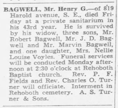 Henry Glenn Bagwell was born on 28 May 1899 in Georgia. He was the son of James Albert Bagwell and Amanda Jane Talton. Henry Glenn Bagwell married Nellie Mae Beaden after 1915. Henry Glenn Bagwell died on 1 January 1943 in Fulton County, Georgia, at age 43. He was buried at Rehoboth Cemetery, Tucker, DeKalb County, Georgia.