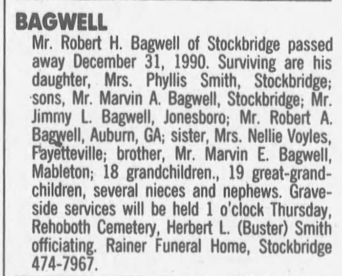 Robert Henry Bagwell was born on 12 July 1918 in Georgia. He was the son of Henry Glenn Bagwell and Nellie Mae Beaden. Robert Henry Bagwell married Alice Agnes Miner after 1935. Robert Henry Bagwell died on 31 December 1990 in Stockbridge, Georgia, at age 72. He was buried at Rehoboth Cemetery, Tucker, DeKalb County, Georgia.