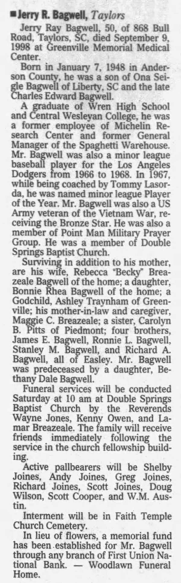 Jerry Ray Bagwell was born on 7 January 1948 in Anderson County, South Carolina. He was the son of Charles Edward Bagwell and Ona Bell Seigle. Jerry Ray Bagwell married Rebecca June Breazeale on 27 April 1968 at West Greenville, South Carolina. Jerry Ray Bagwell died on 9 September 1998 in Greenville Memorial Medical Center, Greenville, Greenville County, South Carolina, at age 50. He was buried at Faith Temple Church of God Cemetery, Taylors, Greenville County, South Carolina.