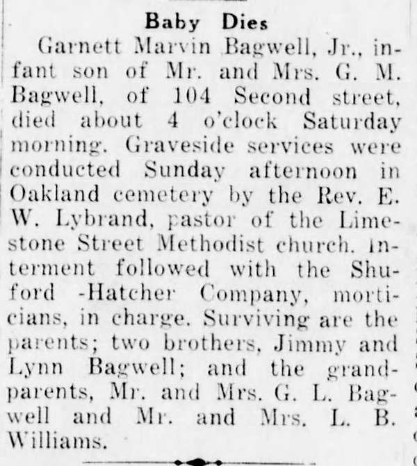 - Infant Son Bagwell b. 1 Jul 1916, d. 1 Jul 1916
