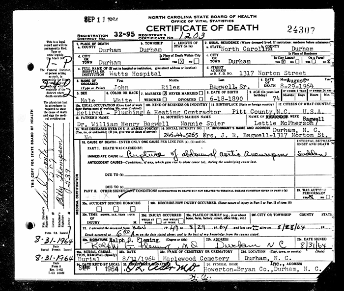 John Riles Bagwell Sr. was born on 18 June 1890 in Pitt County, North Carolina. He was the son of Dr. William Henry Bagwell and Nancy Dorothy Speir. John Riles Bagwell Sr. married Mary C. Lashley on 22 June 1915 at Henderson, Vance County, North Carolina. John Riles Bagwell Sr. married Grace Viola Covington on 25 February 1922 at Durham County, North Carolina. John Riles Bagwell Sr. married Lettie McPherson on 20 May 1944 at Forsyth County, North Carolina. John Riles Bagwell Sr. died on 29 August 1964 in Durham, Durham County, North Carolina, at age 74. He was buried on 31 August 1964 at Maplewood Cemetery, Durham, Durham County, North Carolina.