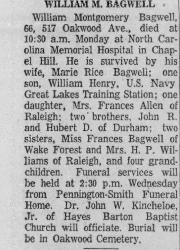 William Montgomery Bagwell was born on 3 October 1893 in Pitt County, North Carolina. He was the son of Dr. William Henry Bagwell and Nancy Dorothy Speir. William Montgomery Bagwell married Marie Antoinette Rice after 1910. William Montgomery Bagwell died on 1 February 1960 in Chapel Hill, Orange County, North Carolina, at age 66 due to bilateral pneumonia. He was buried on 3 February 1960 at Oakwood Cemetery, Raleigh, Wake County, North Carolina.