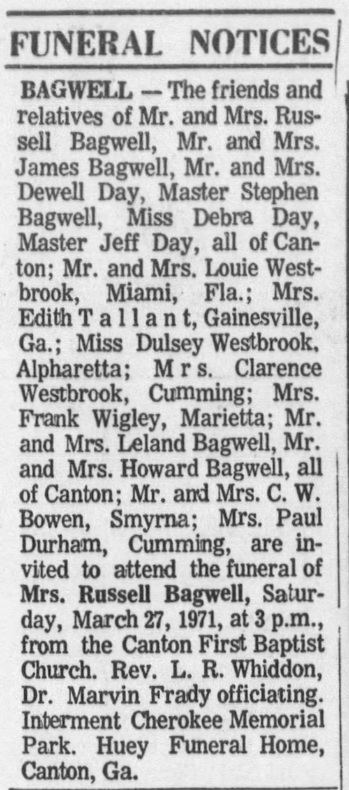 Claudine H. Westbrooks was born on 15 April 1911.1 As of after 1927,her married name was Bagwell. She married Enoch Russell Bagwell, son of Benjamin R. Bagwell and Ruth Ann Poole, after 1927. Claudine H. Westbrooks died on 26 March 1971 at age 59.1 She was buried on 27 March 1971 at Cherokee Memorial Park, Canton, Cherokee County, Georgia.1