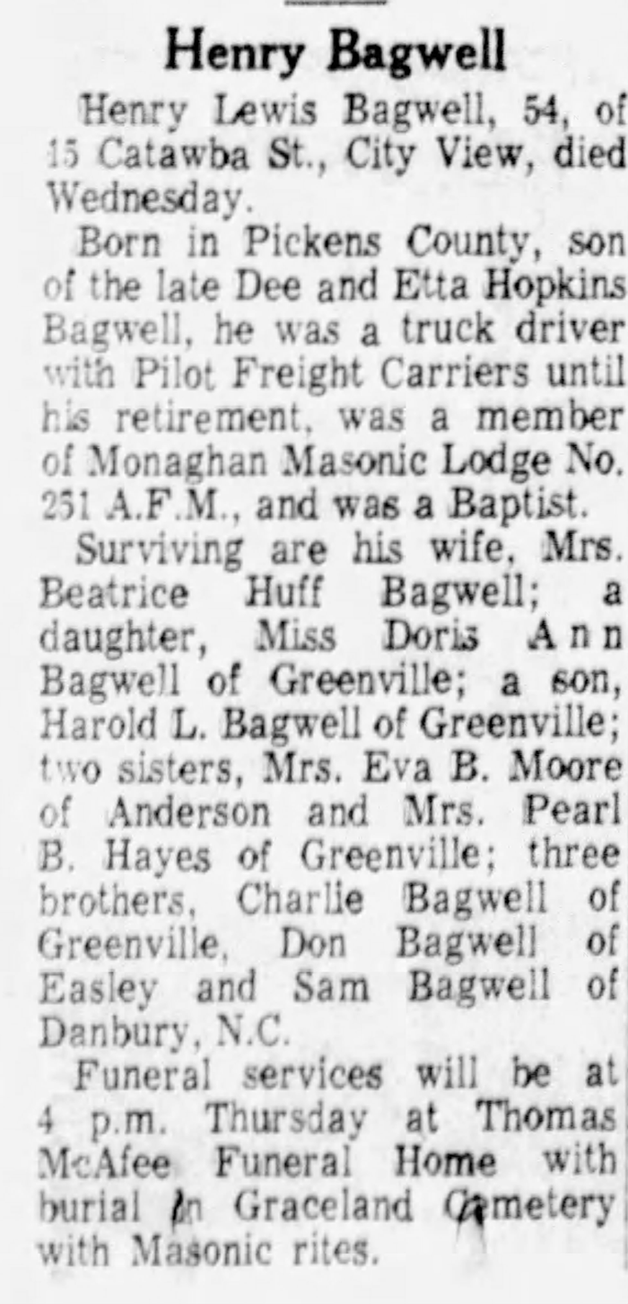 Henry Lewis Bagwell was born on 18 August 1918 in Pickens County, South Carolina.1 He was the son of Calvin David Bagwell and Etta Lillian Hopkins. Henry Lewis Bagwell married Mattie Beatrice "Bea" Huff after 1937.2 Henry Lewis Bagwell died on 9 May 1973 in Greenville, Greenville County, South Carolina, at age 54.1 He was buried on 10 May 1973 at Graceland West Cemetery and Mausoleum, Greenville, Greenville County, South Carolina.1