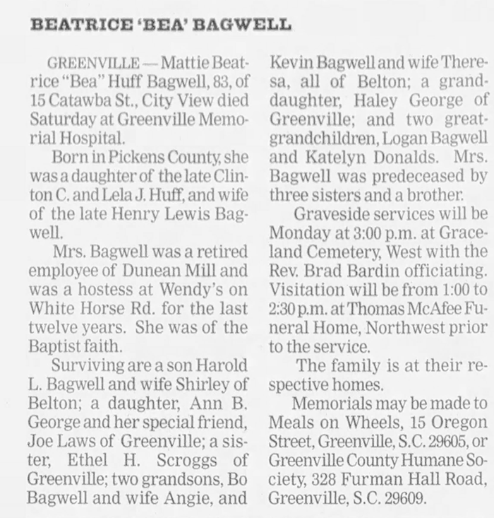 Mattie Beatrice "Bea" Huff Bagwell, 83, of 15 Catawba St., City View, died Saturday at Greenville Memorial Hospital.
