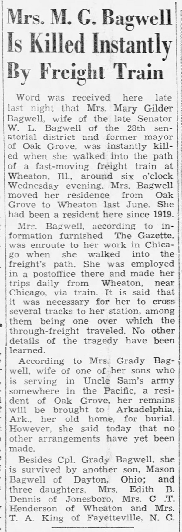Mary Gilidersleeve Coleman was born on 16 March 1884 in Arkadelphia, Clark County, Arkansas. As of 19 November 1905,her married name was Bagwell. She married Walter Lee Bagwell, son of Malroy Mason Bagwell and Amanda C. (Mandy) Gentry, on 19 November 1905 at Camden, Ouachita County, Arkansas. Mary Gilidersleeve Coleman died on 4 January 1944 in Oak Grove, Illinois, at age 59.