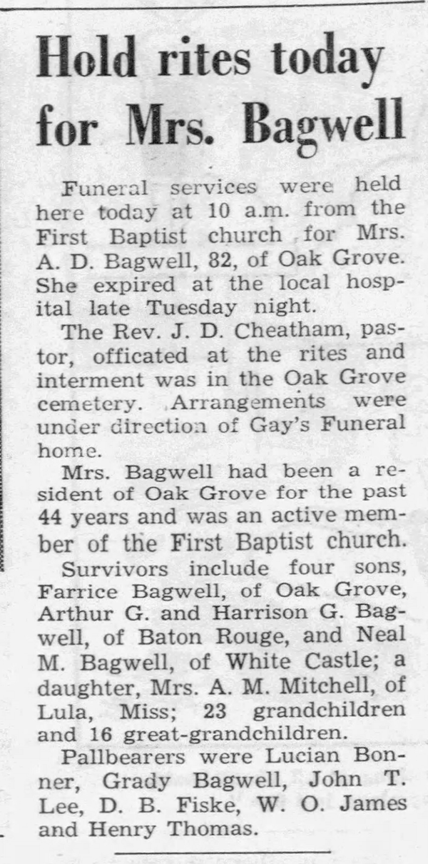 Mrs. Bagwell, a native of Waco, Texas, had been a Morehouse parish resident for over 15 years. She had been in ill health for the past year.