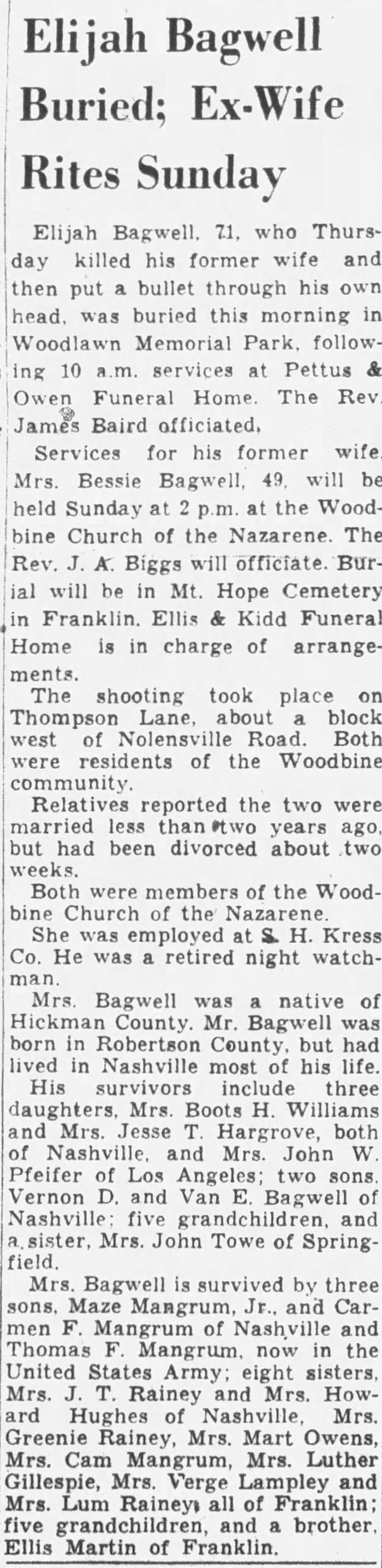 Bessie then married Elijah Bagwell about 1954, they divorced Summer of 1954. They did not have any children.