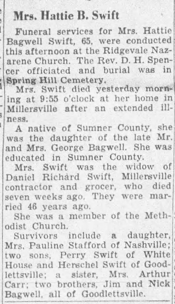 Hattie May Bagwell was born on 28 July 1886 in Sumner County, Tennessee. She was the daughter of George W. Bagwell and Martha Jane Shoemaker. As of 24 December 1905,her married name was Swift. Hattie May Bagwell married Daniel Richard Swift on 24 December 1905. Hattie May Bagwell died on 8 March 1951 in Sumner County, Tennessee, at age 64. She was buried on 9 March 1951 at Spring Hill Cemetery, Nashville, Davidon County, Tennessee.