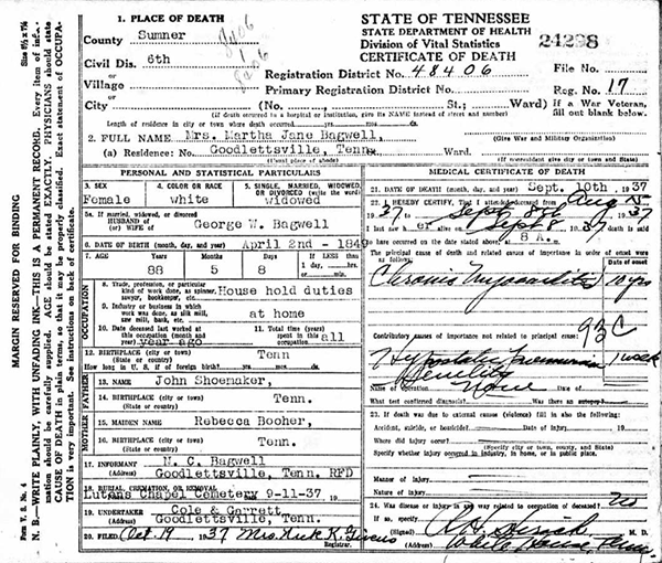 Martha Jane Shoemaker was born on 2 April 1849 in Robertson County, Tennessee. As of 9 January 1872,her married name was Bagwell. She married George W. Bagwell on 9 January 1872 at Robertson County, Tennessee. Martha Jane Shoemaker died on 19 September 1937 in Sumner County, Tennessee, at age 88. She was buried at Lutons United Methodist Church Cemetery, Goodlettsville, Davidson County, Tennessee.