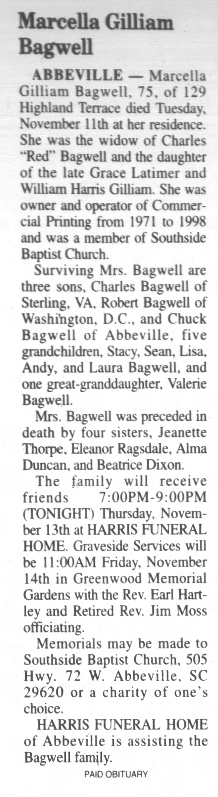 Marcella Gilliam Bagwell, 75, of 129 Highland Terrace died Tuesday, November 11th at her residence. She was the widow of Charles "Red" Bagwell and the daughter of the late Grace Latimer and William Harris Gilliam. She was owner and operator of Commercial Printing from 1971 to 1998 and as a member of Southside Baptist Church.