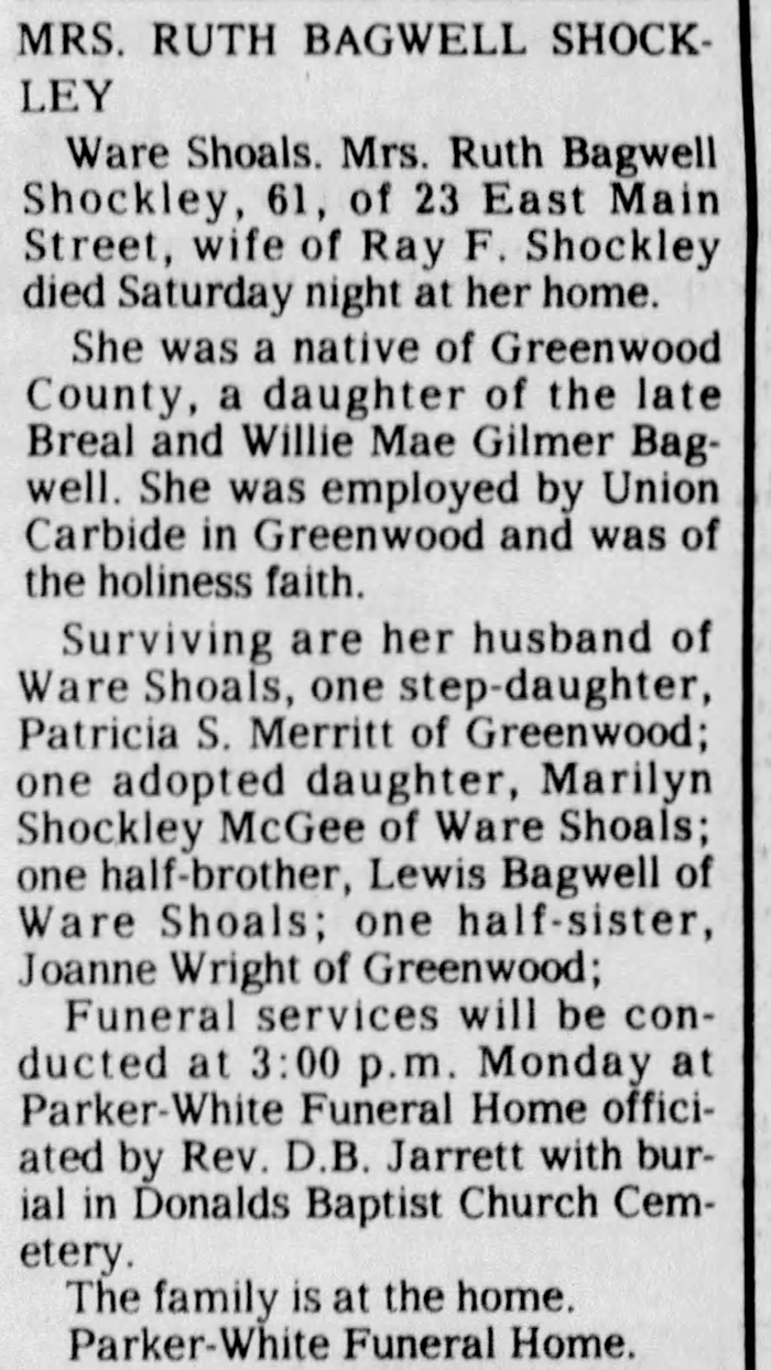 Anna Ruth Bagwell was also known as Ruth Bagwell. She was born on 19 June 1924 in Greenwood County, South Carolina.1 She was the daughter of William Brayile Bagwell and Willie Mae Gilmer. As of after 1945,her married name was Shockley. Anna Ruth Bagwell married Ray Franklin Shockley after 1945. Anna Ruth Bagwell died on 17 August 1985 in Greenwood, Greenwood County, South Carolina, at age 61 of llung cancer that metastasized to her brain.1 She was buried on 19 August 1985 at Donalds Cemetery, Donalds, Abbeville County, South Carolina.1