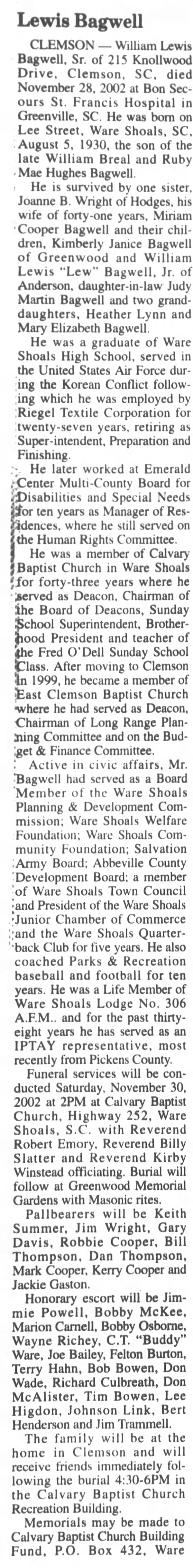 William Lewis Bagwell Sr was born on 5 August 1930 in Ware Shoals, Greenwood County, South Carolina.1 He was the son of William Brayile Bagwell and Ruby Hughes.1 William Lewis Bagwell Sr married Miriam Janice Cooper on 15 July 1961. William Lewis Bagwell Sr died on 28 November 2002 in Greenville, Greenville County, South Carolina, at age 72.1 He was buried at Greenwood Memorial Gardens, Hodges, Greenwood County, South Carolina.1