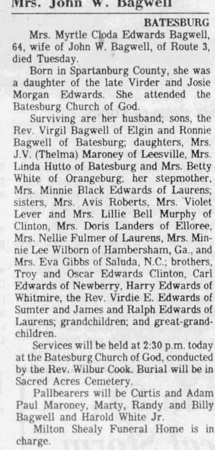 Myrtle Cloda Edwards was also known as Claudia M. Edwards. She was born on 9 April 1919 in South Carolina.1 As of 29 August 1936,her married name was Bagwell. She married John William Bagwell, son of Milton Otis Bagwell and Fair Bell Davenport, on 29 August 1936 at Laurens, South Carolina. Myrtle Cloda Edwards died on 23 August 1983 in Lexington, Lexington County, South Carolina, at age 64.1 She was buried at Sacred Acres Cemetery, Waterloo, Laurens County, South Carolina.1