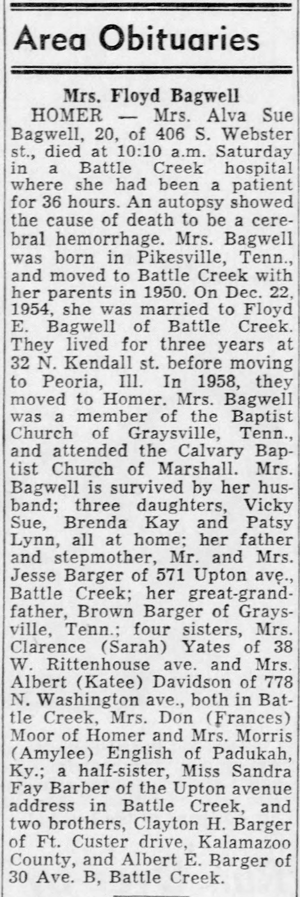Alva Sue Barger was born circa 1941 in Pikesville, Tennessee.1 As of 22 December 1954,her married name was Bagwell. She married Floyd Edward "Arkie" Bagwell, son of Emmett Gilmore Bagwell and Ruby Inez Chism, on 22 December 1954.1 Alva Sue Barger and Floyd Edward "Arkie" Bagwell lived in 1958 in Homer, Michigan.1 Alva Sue Barger died on 28 May 1960 in Battle Creek, Michigan.1