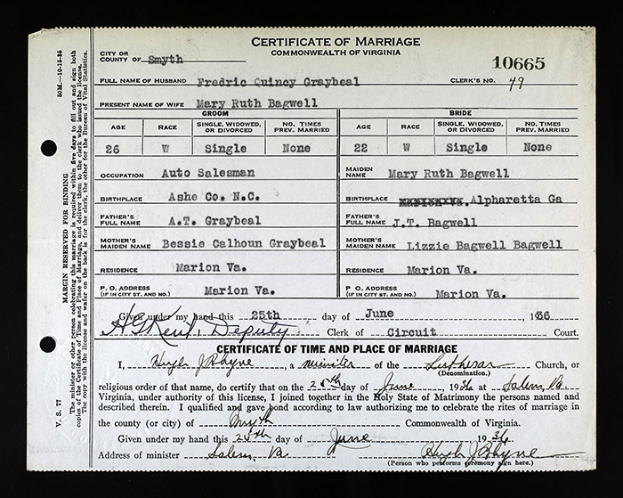 Mary Ann Bagwell was born on 20 July 1933 in Canton, Cherokee County, Georgia.1,2 She was the daughter of Robert Glen Bagwell and Hassie Jane Cagle.1,2 Mary Ann Bagwell married Richard Boyd Bradshaw on 30 June 1951.2,1 As of 30 June 1951,her married name was Bradshaw. Mary Ann Bagwell died on 16 September 2022 in Canton, Cherokee County, Georgia, at age 89. She was buried at Cherokee Memorial Park, Canton, Cherokee County, Georgia.