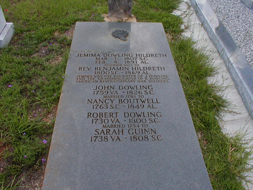 Jemima Anna Dowling was born on 1 March 1807 in Darlington District, South Carolina.1 She was the daughter of John W. Dowling and Nancy Boutwell.2 Jemima Anna Dowling married Reverend Benjamin J. Hildreth, son of Benjamin Hildreth and Mary Latham, in 1823 at Darlington District, South Carolina.3,2,1 As of 1823,her married name was Hildreth.3 Jemima Anna Dowling and Reverend Benjamin J. Hildreth lived in 1850.1 Jemima Anna Dowling died on 8 February 1891 in City Cemetery, Enterprise, Coffee County, Alabama, at age 83.3 She was buried at Carmichael Chapel (City Cemetery?), Coffee County, Alabama.