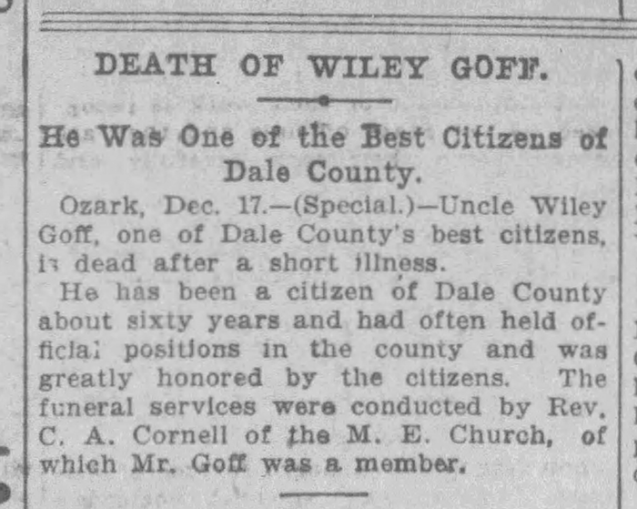 Mr. Cox is a very successful farmer and makes plenty at home and lends some money. He He is a democrat in princilple and has been all along. He was elected County Commissioner in 1884 and while he was County Commissioner he was largely interested and did much to procure the first brick court house we had. About four years ago he was again elected County Commissioner. Often he has been called upon to do and manage and look after the important bridge work of the county and he was a moving spirit in getting the construction of the present court house, ably backed by Uncle Lewis Moseley, and this court house stands as a monument today to their progressiveness. He was a member of the 53rd Alabama Regiment and marched to the front in defense of his country's rights. He is a great believer in Dale county and where he was born he says is good enought place for him to die.