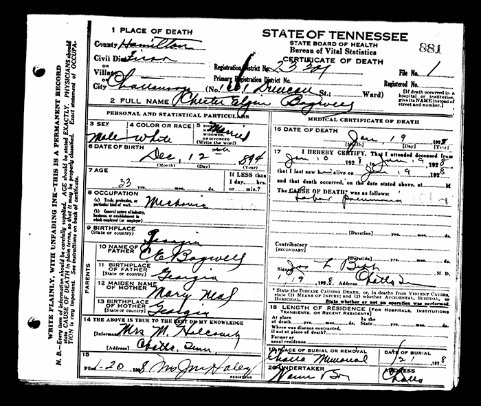 Annie Lee Haggard was born on 26 February 1898 in Winchester, Franklin County, Tennessee. As of 1 June 1921,her married name was Bagwell. She married Chester Elgin Bagwell, son of Chester Elgin Bagwell and Mary Neal, on 1 June 1921 at Chattanooga, Tennessee. Annie Lee Haggard died on 21 January 1971 in Chattanooga, Hamilton County, Tennessee, at age 72.
