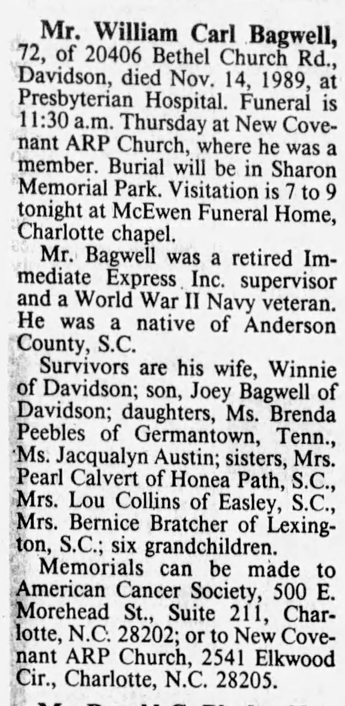 Survivors are his wife, Winnie of Davidson; son, Joey Bagwell of Davidson; daughters, Ms. Brenda Peebles of Germantown, Tenn., Ms. Jacqualyn Austin; sisters, Mrs. Pearl Calvert of Honea Path, S.C., Mrs. Lou Collins of Easley, S.C., Mrs. Bernice Bratcher of Lexington, S.C; six grandchildren.