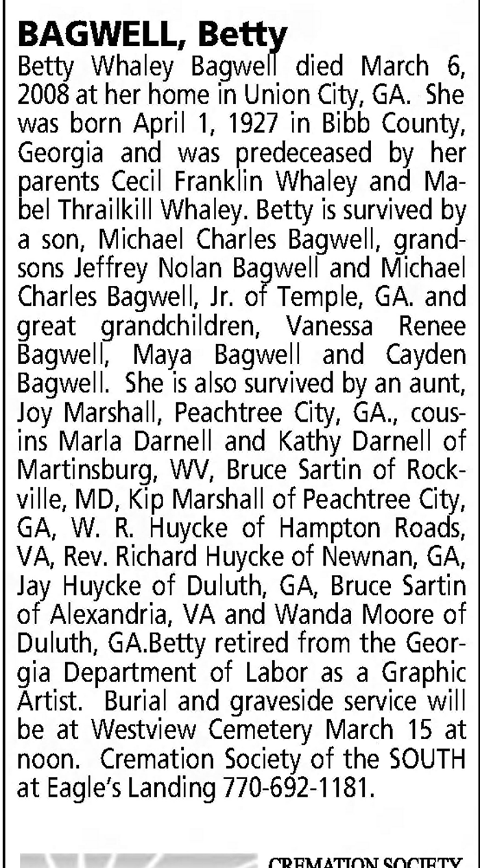 Betty Whaley Bagwell died March 6, 2008. She was born April 1, 1927 in Bibb County. She was preceded in death by her parents, Cecil Franklin and Mabel Thrailkill Whaley. She was retired from the Georgia Department of Labor as a graphic artist. Graveside services were at Westview Cemetery, Atlanta. Survivors include a son, Michael Charles Bagwell; grandsons, Jeffery Nolan Bagwell and Michael Charles Bagwell, Jr., Temple, Ga; great-grandchildren, Vanesse Rene Bagwell, Maya Bagwell, and Cayden Bagwell; an aunt, Joy Marshall, Peachtree City; and cousins, Maria Darnell and Kathy Darnell, both of Martinsburg, W. Va., Bruce Sartin, Rockville, Md., Kip Marshall, Peachtree City, W. R. Huycke, Hampton Roads, Va., the Rev. Richard Huycke, Newman, Jay Huycke, and Wanda Moore, both of Duluth, and Bruce Sartin, Alexandra, Va. Cremation Society of the South at Eagle's Landing was in charge.