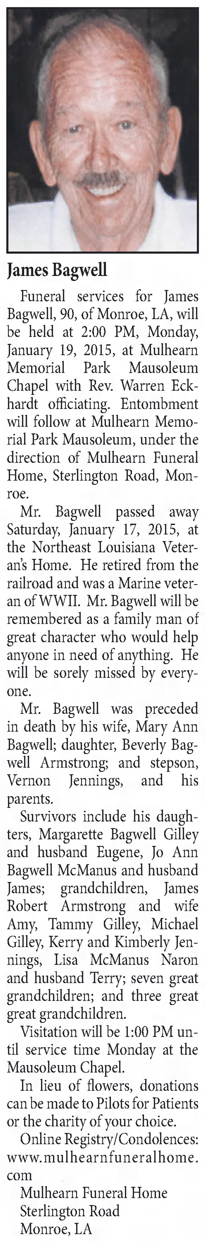 Funeral services for James Bagwell, 90, of Monroe, LA, will be held at 2:00 PM, Monday, January 19, 2015, at Mulhearn Memorial Park Mausoleum Chapel with Rev. Warren Eckhardt officiating. Entombment will follow at Mulhearn Memorial Park Mausoleum, under the direction of Mulhearn Funeral Home, Sterlington Road, Monroe.