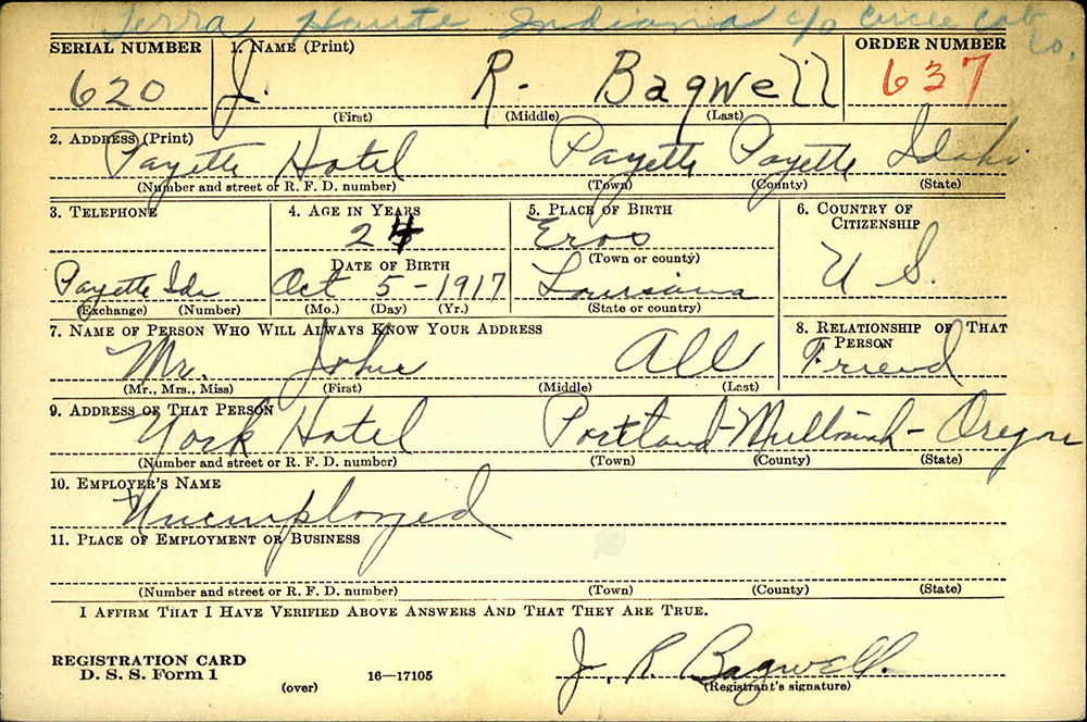 He enlisted the second time (May 29, 1942) at Fort Benjamin Harrison, Indiana (Indianapolis, IN). He is listed as a native of Louisiana and residence in Vigo County, Indiana. He birth year is 1917.1 He married Helen Virginia Leatherwood on 16 February 1942 at Brazil, Indiana. James Robert Bagwell married Grace S. Boyatt on 3 July 1943 at Pocatello, Bannock County, Idaho. James Robert Bagwell lived in 1947 in Terre Haute, Indiana. He and Aderine Grace Satterfield lived in 1949 in Pocatello, Idaho. James Robert Bagwell and Aderine Grace Satterfield lived in 1956 in Pocatello, Idaho. James Robert Bagwell married Jean (?) before 1985. James Robert Bagwell and Jean (?) were divorced on 26 April 1985 at Marion County, Oregon. James Robert Bagwell died on 21 January 2006 in Boise, Ada County, Idaho, at age 88.1 He was buried at Idaho State Veterans Cemetery, Boise, Ada County, Idaho.1