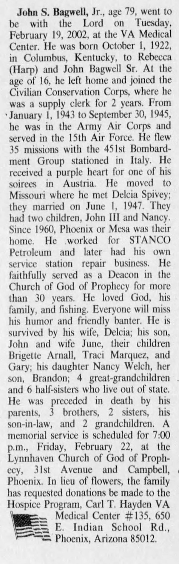 He served in the 15th Air Force. He flew 35 missions wiht the 451st Bombardment Group stationed in Italy. He received a purple heart for one of his sorties i Austria. They flew B-24 Bombers and Operated with Fifteenth AF, Jan 1944-May 1945, functioning primarily as a strategic bombardment organization. Attacked such targets as oil refineries, marshalling yards, aircraft factories, bridges, and airfields in Italy, France, Germany, Czechoslovakia, Austria, Hungary, Rumania, Bulgaria, Albania, and Greece. Received a DUC for each of three missions: to an aircraft factory at Regensburg on 25 Feb 1944, to oil refineries and marshalling yards at Ploesti on 5 Apr 1944, and to an airdrome at Vienna on 23 Aug 1944; although encountering large numbers of enemy fighters and severe antiaircraft fire during each of these missions, the group fought its way through the opposition, destroyed many interceptors, and inflicted serious damage on the assigned targets. At times the group also flew support and interdictory missions. Helped to prepare the way for and participated in the invasion of Southern France in Aug 1944. Transported supplies to troops in Italy during Sep 1944. Supported the final advances of Allied armies in northern Italy in Apr 1945. Returned to the US in Jun. Inactivated on 26 Sep 1945.1 John Sylvester Bagwell Jr. married Delcia Loraine Spivey on 1 June 1947 at Missouri. John Sylvester Bagwell Jr. died on 19 February 2002 in Phoenix, Maricopa County, Arizona, at age 79.1 He was buried at National Memorial Cemetery of Arizona, Phoenix, Maricopa County, Arizona.1