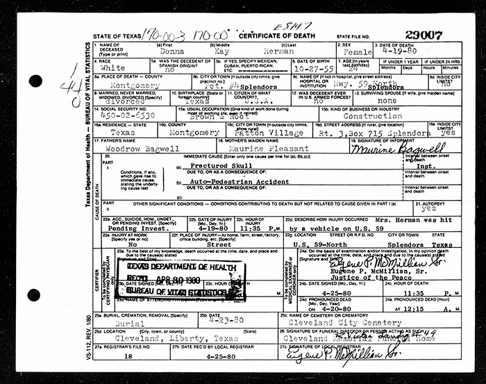 Donna Kay Bagwell was born on 27 October 1955 in Harris County, Texas.1 She was the daughter of Woodrow Lattin Bagwell Sr. and Maureen Pleasant. As of 7 April 1973,her married name was Herman. Donna Kay Bagwell married Frank Herman on 7 April 1973 at Liberty, Texas. Donna Kay Bagwell and Frank Herman were divorced before 1980. Donna Kay Bagwell died on 19 April 1980 at age 24 of a fractured skull in a automobile-pedestrian accident on US Highway 59 North in Splendora, Texas based on the original death certificate. In 2020, her body was exhumed and dtermined it was not an automobile-pedestrian accident, but rather a homicide.1 She was buried at Cleveland City Cemetery, Cleveland, Liberty County, Texas.