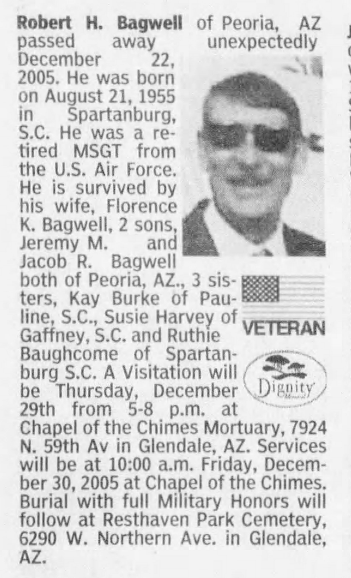 Robert Henry Bagwell was born on 21 August 1955 in Spartanburg County, South Carolina. He was the son of Robert Curtis Bagwell and Betty Gertrude Wyatt. Robert Henry Bagwell married Florence (?) after 1973. Robert Henry Bagwell died on 22 December 2005 in Peoria, Arizona, at age 50