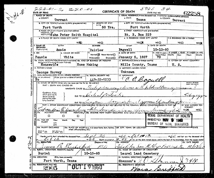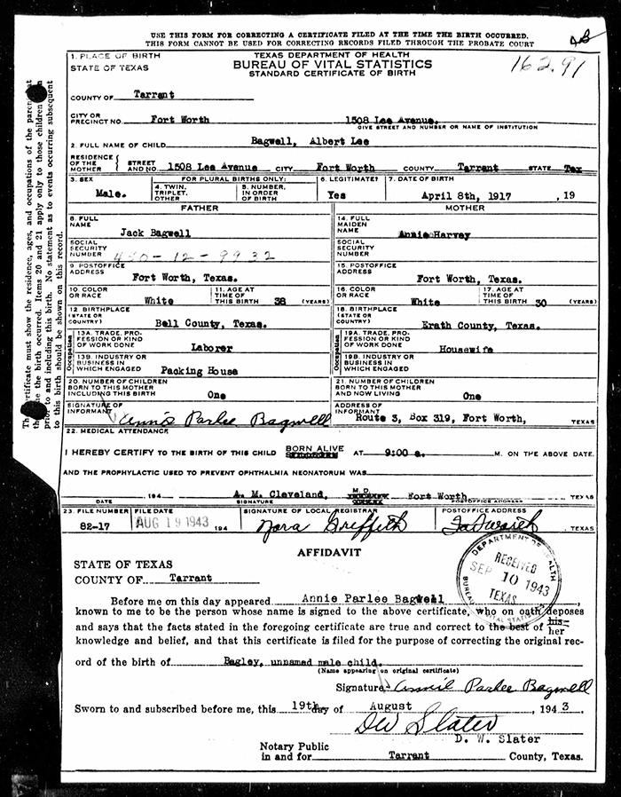 Albert Lee Bagwell was born on 8 April 1917 in Tarrant County, Texas. He was the son of Andrew Jackson Bagwell and Annie Pairlee Harvey. Albert Lee Bagwell married Mattie Lou (?) after 1945. Albert Lee Bagwell died on 31 October 1964 in Fort Worth, Tarrant County, Texas, at age 47. He was buried on 2 November 1964 at Laurel Land Memorial Park, Fort Worth, Tarrant County, Texas.