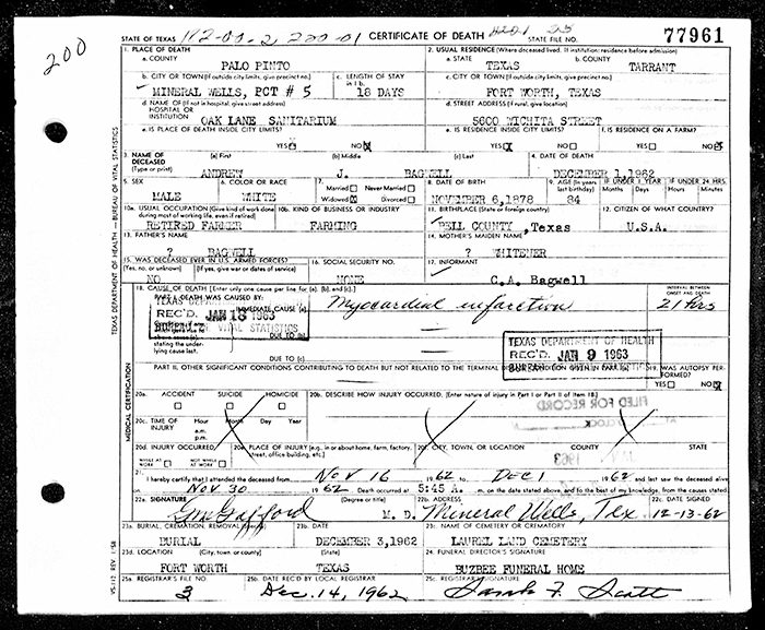- Andrew Jackson Bagwell+ b. Dec 1878, d. 1 Dec 1962