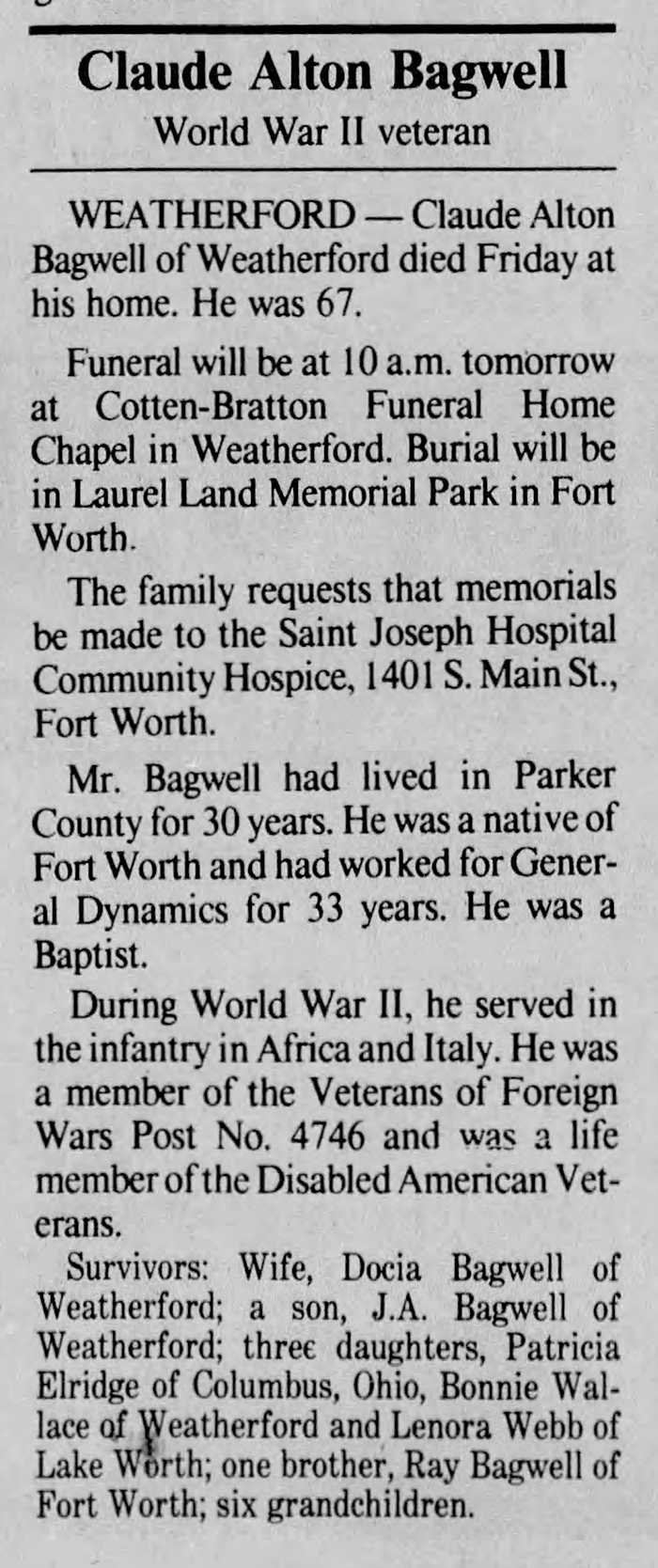 Claude Alton Bagwell was born on 17 April 1922 in Parker County, Texas. He was the son of Andrew Jackson Bagwell and Annie Pairlee Harvey. He served in World War II in the US Army in Company M, 351st Infantry, 88th Division in Africa and Italy.1 Claude Alton Bagwell married Docia May Littlefield after 1945. Claude Alton Bagwell died on 19 May 1989 in Weatherford, Texas, at age 67.1 He was buried on 22 May 1989 at Laurel Land Memorial Park, Fort Worth, Tarrant County, Texas.1