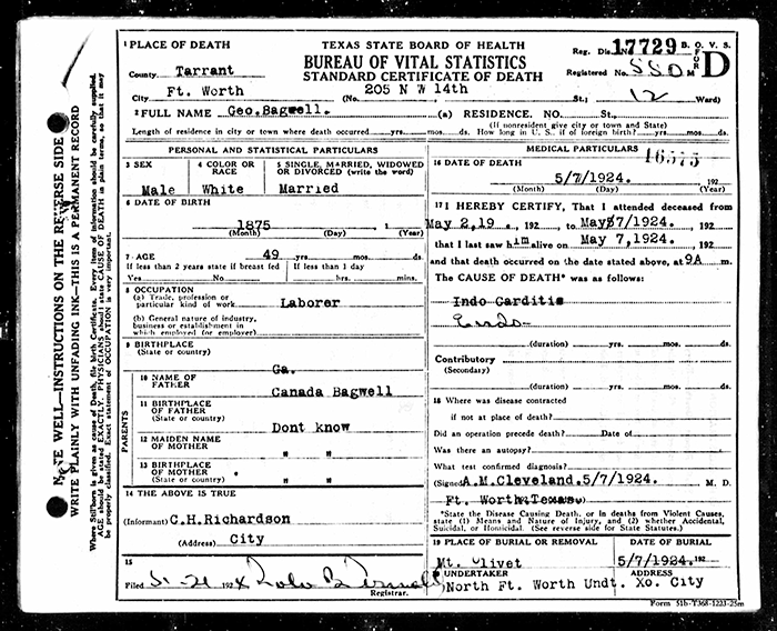 George Wiley Bagwell was born on 10 July 1875 in Georgia. He was the son of Kennedy Canida Bagwell and Ellen Richardson. George Wiley Bagwell lived in 1909 in Fort Worth, Texas. He married Laura Bell on 12 November 1910 at Oklahoma County, Oklahoma. George Wiley Bagwell lived in 1911 in Fort Worth, Texas. He died on 7 May 1924 in Tarrant County, Texas, at age 48. He was buried at Mount Olivet Cemetery, Fort Worth, Tarrant County, Texas.