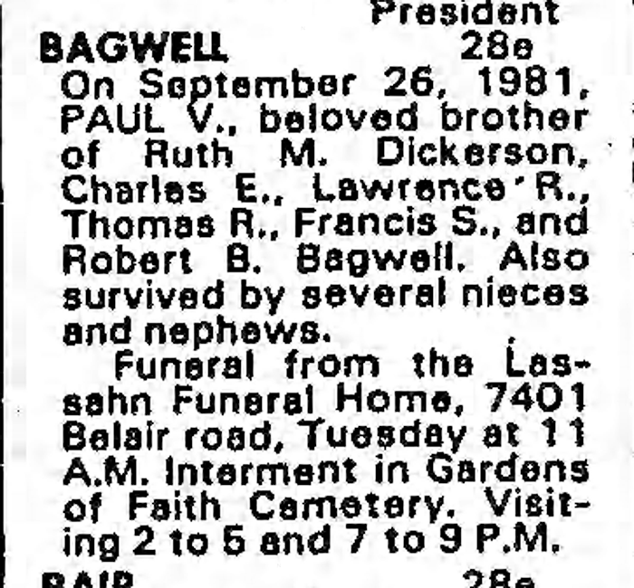 Paul Vincent Bagwell was born on 27 July 1911 in Baltimore, Maryland. He was the son of John Wilbur Bagwell and Clara Olivia Fick. Paul Vincent Bagwell died on 26 September 1981 in Baltimore, Maryland, at age 70. He was buried on 29 September 1981 at Gardens of Faith Cemetery, Rosedale, Baltimore County, Maryland.
